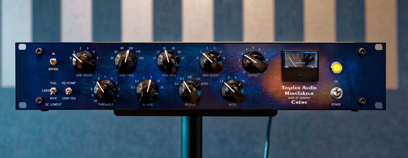 The Creme puts the very best of both functions into one device. The passive EQ has been reduced down to the most popular applications: Bass boost, to give greater definition to the bass, and treble boost, to give the mix the necessary shine. The boost has been made switchable to enable total recall and to reduce the boost to more appropriate levels for use on the master channel.